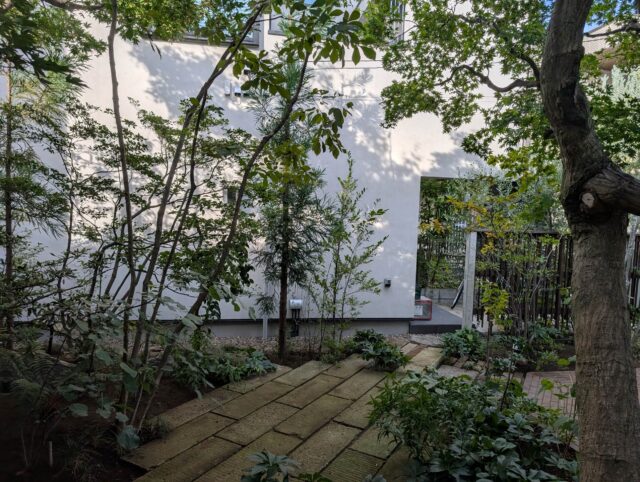人の多い場所の近くに落ち着いた庭がある事で別世界のようになります。