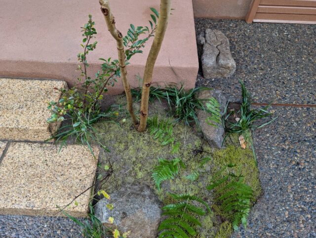 洗い出し駐車場と玄関前に少し木を植え、コケをはって仕上げました。