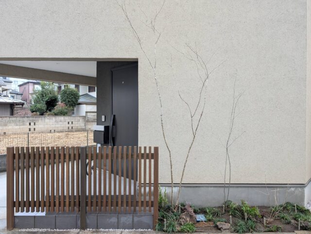 砂利敷きだけだった場所に、フェンスと植栽で2,3日で作りました。新緑が楽しみです。