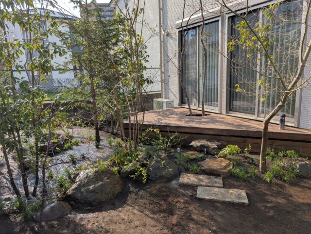 前回投稿したウッドデッキの周りに植栽して庭にしました。